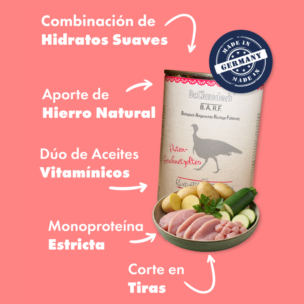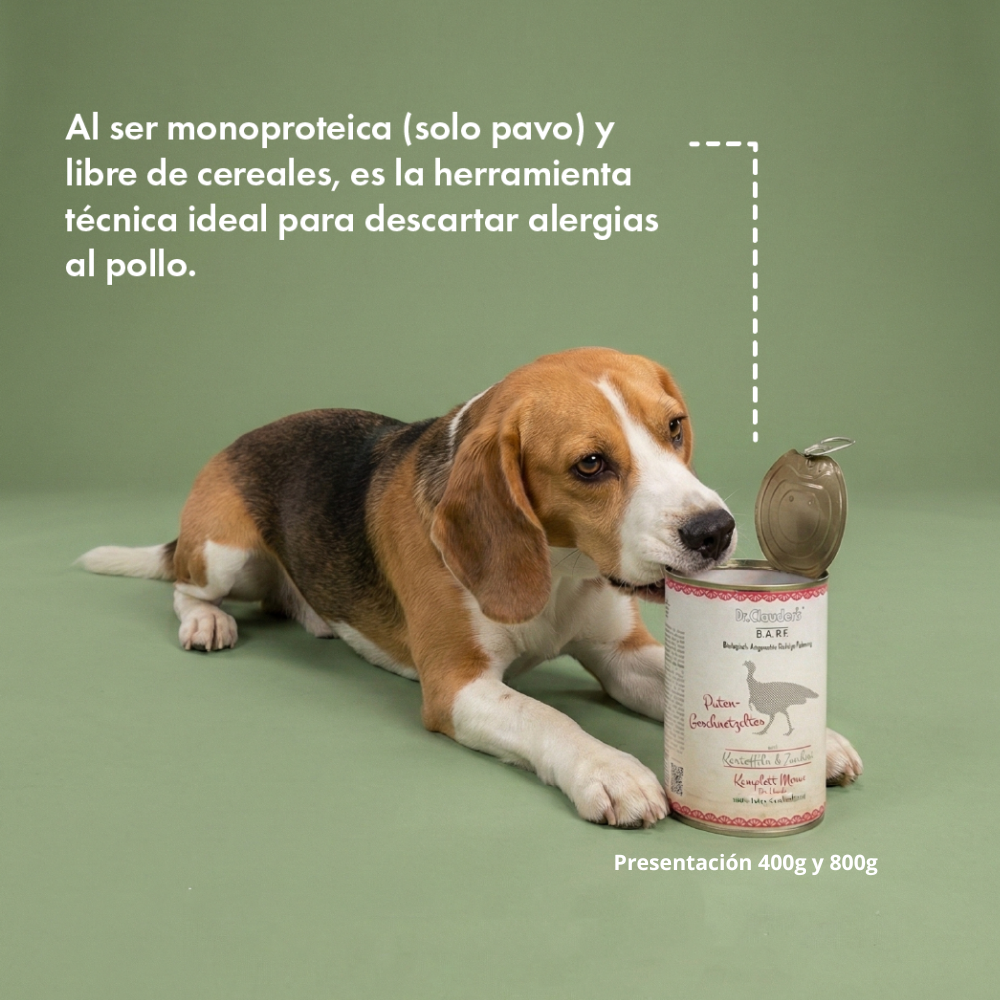 Monoproteína Estricta (Hipoalergénica): Elaborada 100% con proteína de pavo (88% del total de la lata). Es la opción más segura y recomendada si tu perro presenta intolerancias a proteínas comunes como el pollo o la carne de res.