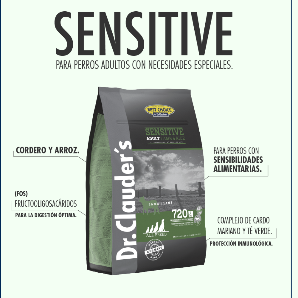 El cordero y arroz es perfecto para perros adultos de todas las razas con necesidades especiales, se digiere de manera óptima gracias a sus fibras alimentarias (FOS) fructooligo- sacáridos, de efecto prebiótico, procedentes de la achicoria. Favorece la absorción de nutrientes y se tolera bien debido a sus valiosas fuentes de proteina de origen animal y vegetal. Resulta especialmente equilibrado en su relación entre proteina y energía para que el perro permanezca en forma saludable. Contiene un complejo a base de té verde y cardo mariano. El té verde es conocido por su efecto en el refuerzo de las defensas y al cardo mariano como protector hepático.