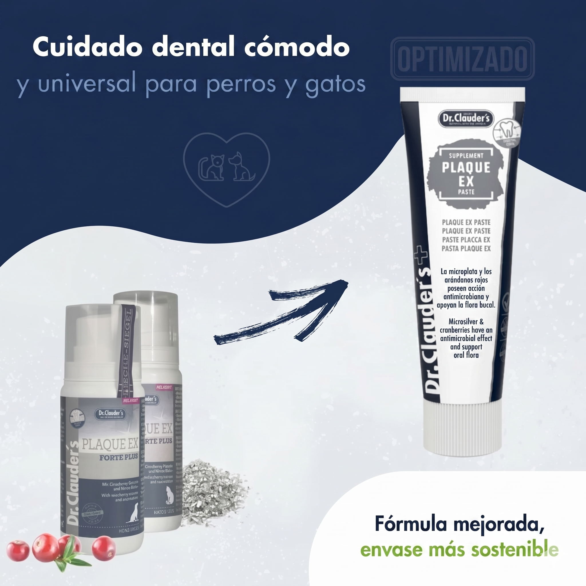 ¿Sabías que puedes limpiar los dientes de tu mascota sin usar un cepillo? Nuestra Plaque Ex Paste es un snack funcional de alta gama diseñado para perros y gatos que no toleran el cepillado tradicional. Gracias a su avanzada fórmula alemana, proteger su sonrisa ahora es tan fácil como dejar que disfruten de su sabor.