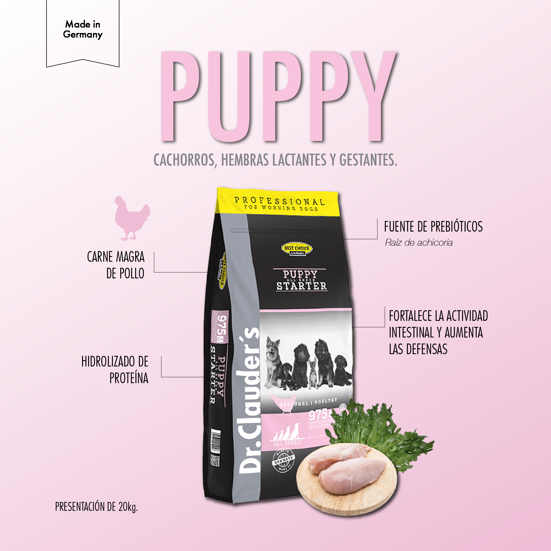 Alimento seco completo y balanceado para cachorros hasta los 12 meses de edad, también para hembras gestantes y lactantes. Dieta elaborada con carne de pollo e hidrolizado de proteína. Cuenta con raíz de achicoria como fuente prebiótica que fomenta una actividad intestinal regular y fortalece las defensas.