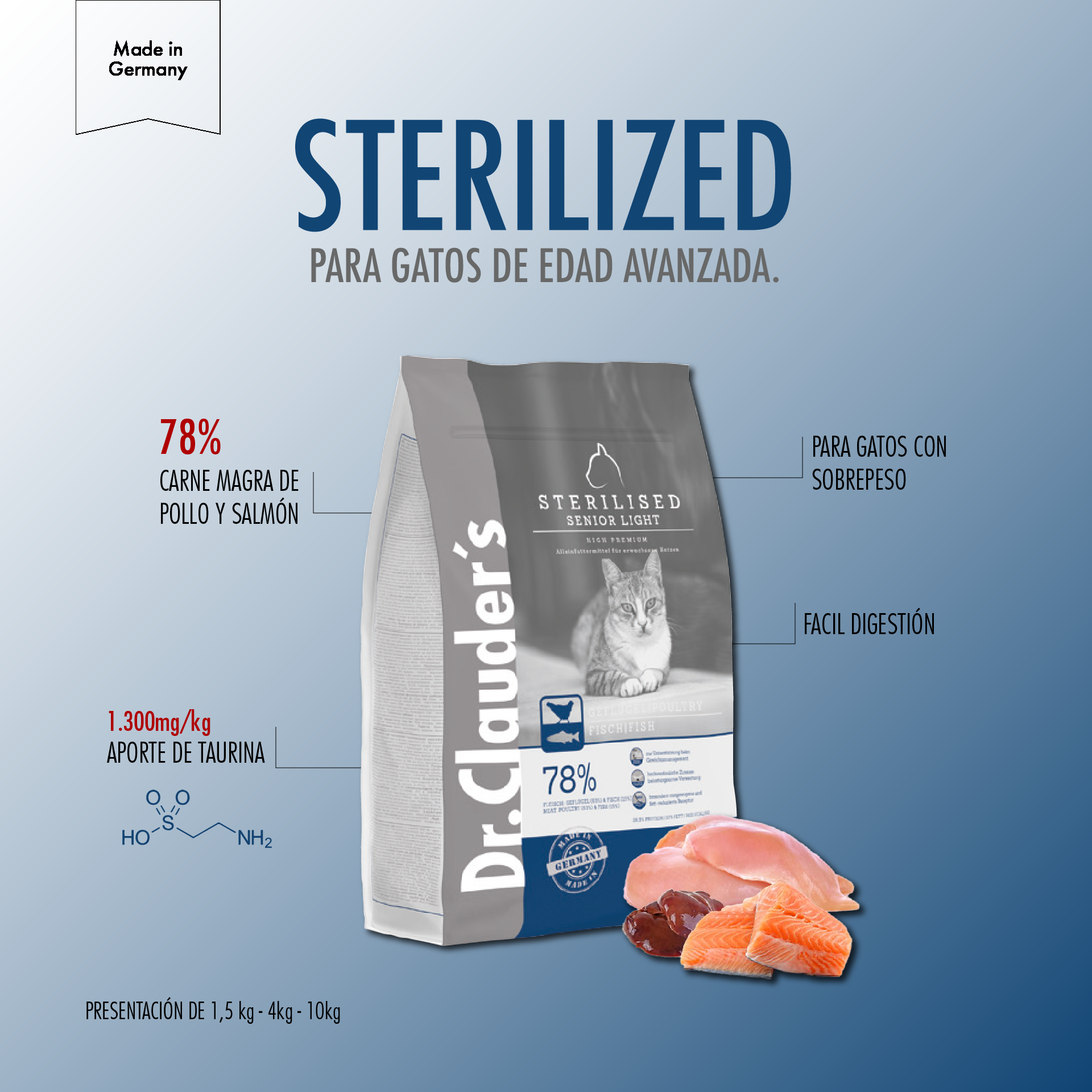 Alimento completo y balanceado para gatos con sobrepeso, en edad avanzada y esterilizados. Elaborado a base de carne de pollo y salmón. Contiene un aporte de Taurina de 1.300mg/kg, que provee un aporte energéti- co adecuado de fácil digestión.
